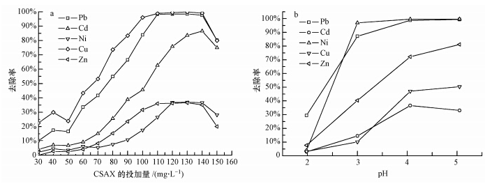 取質量濃度相同(均為25 mg · L-1)的Cd(Ⅱ)、Cu(Ⅱ)、Ni(Ⅱ)、Pb(Ⅱ)、Zn(Ⅱ)混合離子水樣,調節pH為6.0,投加不同量的CSAX,或固定CSAX投加量,調節pH為不同值,進行絮凝實驗,結果如圖 6所示.