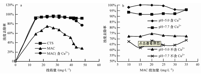 取pH=5.5,濁度為90 NTU的水樣,按以下方法做絮凝實驗以期比較:①單獨投加殼聚糖溶液除濁;②單獨投加MAC除濁;③在有Cu2+(25 mg · L-1)的條件下,投加MAC除濁,結果如圖 7a所示.在濁度為160 NTU的高嶺土懸濁液中(含25 mg · L-1 Cu2+),調節溶液pH值至不同值,投加MAC除濁,結果見圖 7b.