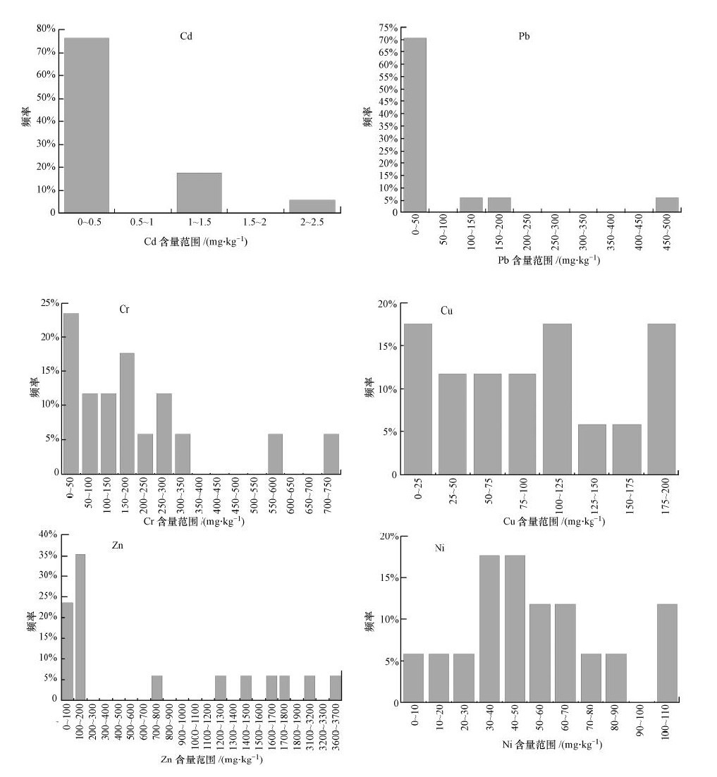 為更好地反映江蘇省印染污泥的重金屬情況,圖 3統計分析了6種重金屬的分布情況.可以看出,17家印染污泥中,76%的印染污泥中含Cd量在0.5 mg · kg-1以內,70%的污泥中含Pb量在50 mg · kg-1以下,污泥中的Zn含量大多在200 mg · kg-1以內且53%集中在90~120 mg · kg-1之間,Cr、Cu和Ni的含量分布相對均勻.