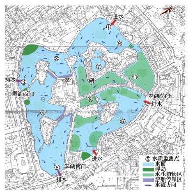 按照每月1次的采樣頻率,在湖面選擇10個監(jiān)測點(圖 1)進(jìn)行代表性污染物的連續(xù)監(jiān)測,包括進(jìn)水點1個(1#)、排水點2個(3#和5#)、湖心點3個(2#、4#和9#)、湖岸點2個(6#和7#)、水生植物區(qū)2個(8#和10#).由于翠湖屬于淺水湖泊,因此,每個采樣點均只采集水面(0 m)及水面下0.5 m處水樣,取二者平均值作為這一監(jiān)測點的污染物濃度.
