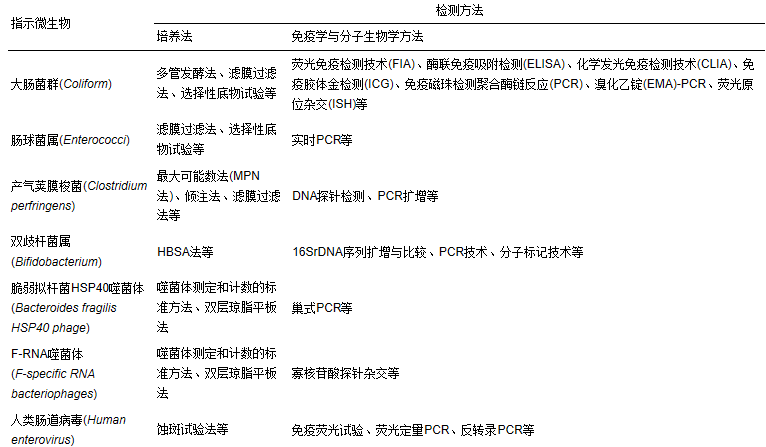 表 2 地表水體中病原微生物的常用指示微生物及其特