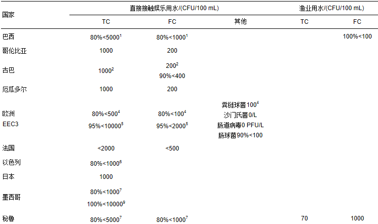 大腸菌群是腸道中最普遍、數量最多的一類細菌,通常包括總大腸菌群和糞大腸菌群(馬寧和肖利紅,2002),這兩種菌群被很多國家用作糞便污染指示菌(見表 7).TC指能在35 ℃、48 h內發酵乳糖產酸產氣、需氧及兼性厭氧、革蘭氏陰性的無芽孢桿菌.TC 常被用于判定一個水體是否適合用作生活用水、飲用水和娛樂用水等其他用途用水的主要生物指標,且作為水體污染程度的衛生質量指標.但因土壤中本身含有該類種群的某些物種,故其不能有效指示糞便污染.FC是TC中將培養溫度升高到44.5 ℃時仍能生長發酵乳糖產酸產氣的大腸菌群(劉瑾,2012),來源于人和溫血動物的糞便中,對糞便污染的指示效果更專一.FC常被用作水質受糞便污染的指示菌,適用于河流、湖泊、廢水處理系統、野外浴場用水、海水等一般性水體.但該菌群的某些物種來自非糞便源,在紙漿水中生長良好,且在造紙廠附近含量很高(USEPA,2006).此外,研究(Gleeson and Gray, 1997)發現所有大腸菌群在水溫合適、有機物充足的地表水體中可再生長.