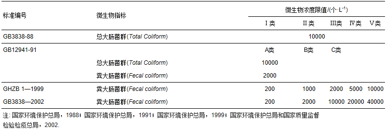 為貫徹與執行《環境保護法(試行)》和《水污染防治法》,我國于1983年首次制定了地表水的質量標準《地面水環境質量標準GB3838-83》,隨后于1988年進行了第一次修訂,形成了《地面水環境質量標準GB3838-88》,該標準適用水體包括江、河、湖泊、水庫等具有適用功能的地面水水域,并根據其使用目的與保護目標將其劃分為5類,其中微生物指標選擇總大腸菌群,僅規定Ⅲ類水體中總大腸菌群濃度不能超過10000個· L-1,該數值為試行標準.1991年,為保護和改善景觀、娛樂用水水質,國家環保總局制定了《景觀娛樂用水水質標準—GB12941-91》,該標準按照水體功能將其分為3類:其中A類水體為與人體直接接觸的景觀娛樂水體.該標準嚴格限定A類水體中總大腸菌群與糞大腸菌群的濃度,主要考慮其與人體的接觸程度.1999年國家環境保護總局根據1997年通過的《中華人民共和國水污染防治法》發布了《地表水環境質量標準GHZB1—1999》.該標準是對《地面水環境質量標準GB3838-88》的修訂,在微生物指標中增加了糞大腸菌群指標,刪除了總大腸菌群指標.該標準于2000年開始實施,《地面水環境質量標準GB3838-88》與《景觀娛樂用水水質標準GB12941-91》同時廢止.2002年,再次修訂后的《地表水環境質量標準GB3838—2002》正式發布,于2002年6月起實施,《地面水環境質量標準GB3838-88》和《地表水環境質量標準GHZB1—1999》同時廢止.該標準的項目共計109項,其中地表水環境質量標準基本項目(24項)、集中式生活飲用水地表水源地補充項目(5項)和集中式生活飲用水地表水源地特定項目(80項),并修訂了糞大腸菌群的濃度限值.至此,我國地表水環境質量標準中的微生物指標完成了從總大腸菌群到糞大腸菌群的轉變(見表 9).微生物濃度限值也發生了巨大的變化.