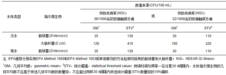 表 4 美國環境保護署2012水質標準中推薦的指示微生物及濃度限值1(USEPA,2012)